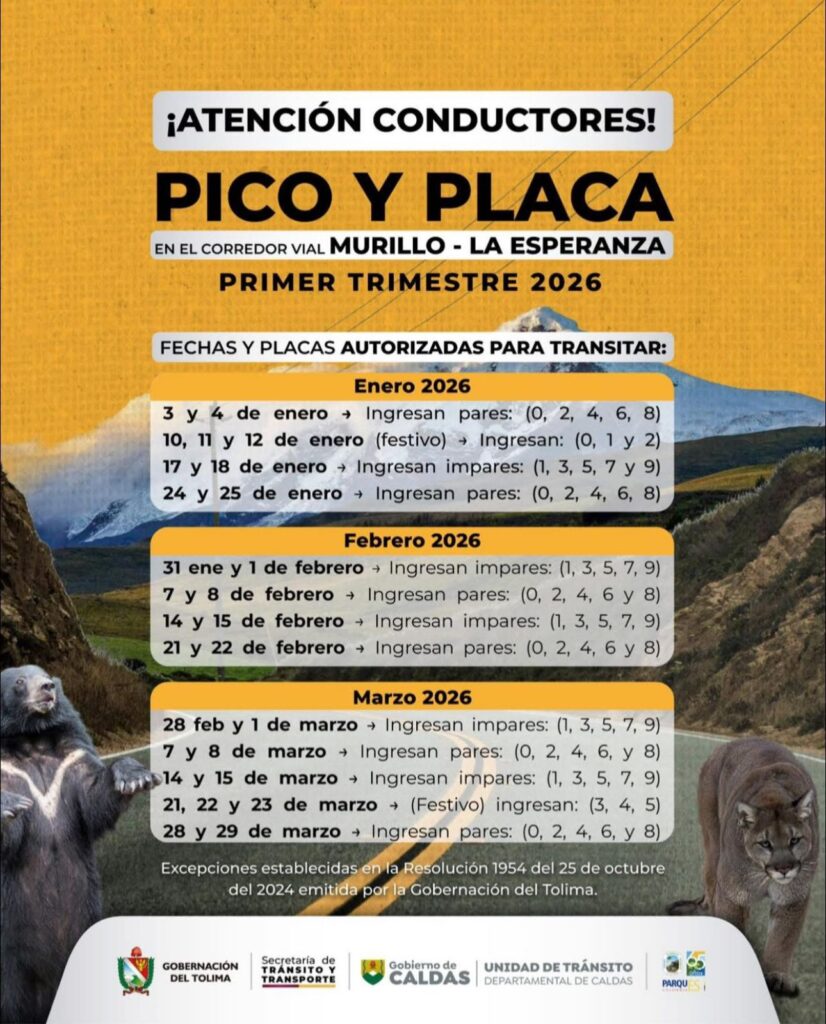 El pico y placa ambiental en la vía entre Murillo y Manizales opera actualmente solo fines de semana y festivos, Esto significa que fuera de este horario establecido, puedes acceder al municipio sin problemas. Es fundamental recordar que esta restricción aplica exclusivamente en la vía nacional entre Murillo y Manizales. Si provienes de departamentos como Cundinamarca, Boyacá, Huila, o ciudades como Ibagué y Bogotá, puedes ingresar al municipio las 24 horas del día.